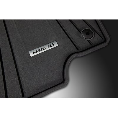 z metalowym logo, wykonane z wysokiej jakości tworzywa sztucznego (TPE), z oryginalnym systemem mocowania dywaników Mazda (cztery pierścienie do mocowania), pojazdy są wyposażone fabrycznie w zaczepy do mocowania dywaników z przodu po stronie kierowcy i pasażera