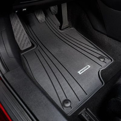 z metalowym logo, wykonane z wysokiej jakości tworzywa sztucznego (TPE), z oryginalnym systemem mocowania dywaników Mazda (cztery pierścienie do mocowania), pojazdy są wyposażone fabrycznie w zaczepy do mocowania dywaników z przodu po stronie kierowcy i pasażera