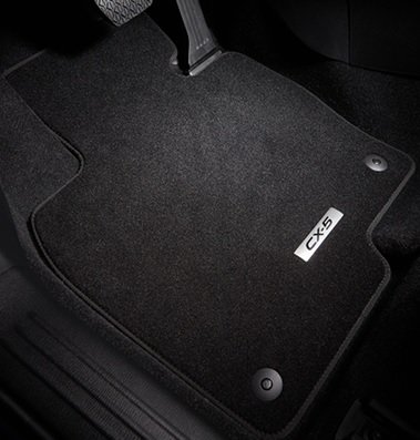 z aluminiowym emblematem CX-5 na wszystkich dywanikach, z oryginalnym systemem mocowania dywaników Mazda (dwa pierścienie do mocowania), wykonane z weluru o gęstości 830g/m², elastyczne od spodu, tkane obszycie krawędzi w stonowanym kolorze, czarne pojedyncze przeszycie przy krawędziach, etykiety z tyłu wszystkich dywaników